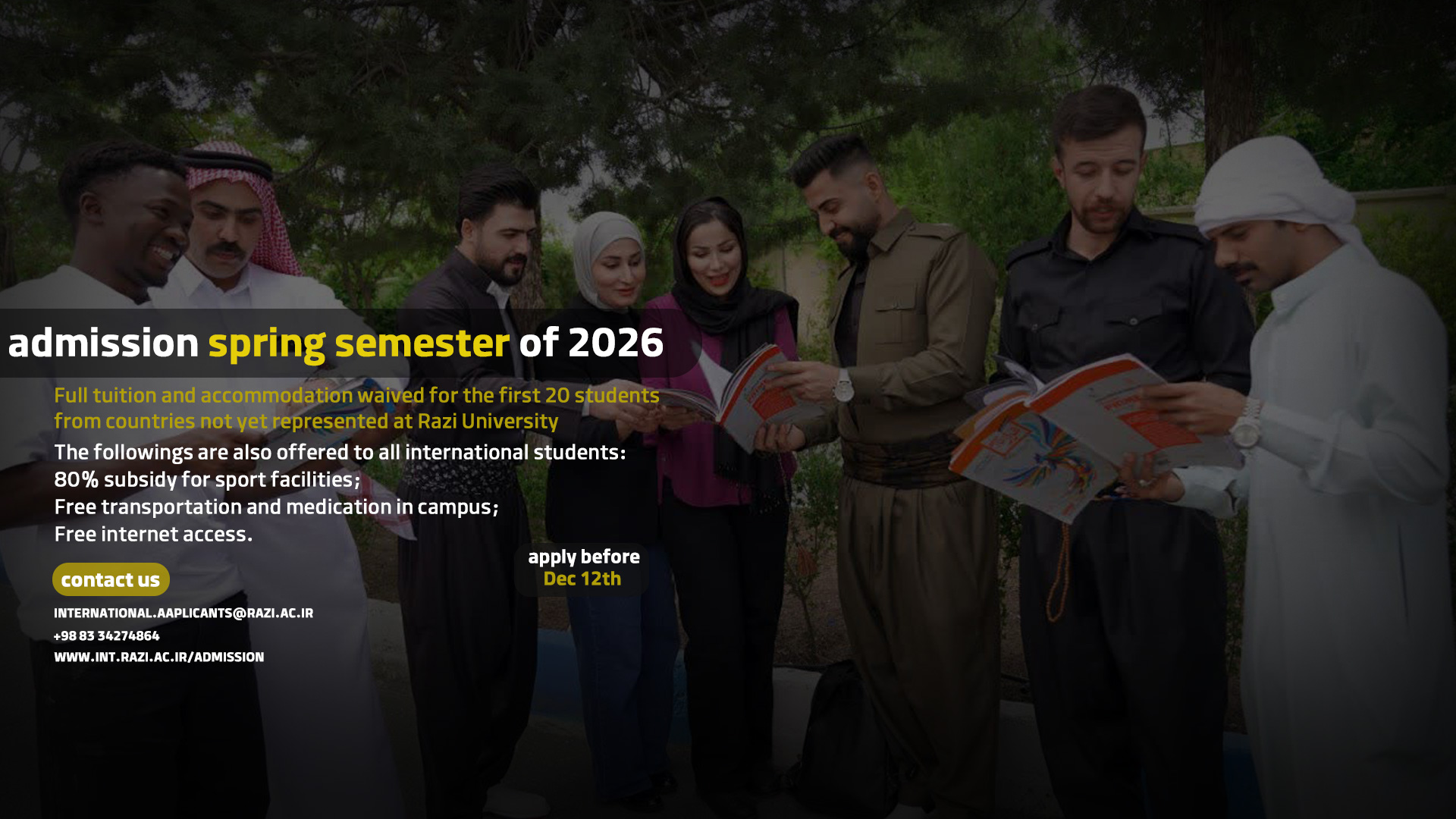 Razi University is pleased to announce the admission of international students for undergraduate, master’s, and doctoral programs for the spring semester of the 2025-2026 academic year.