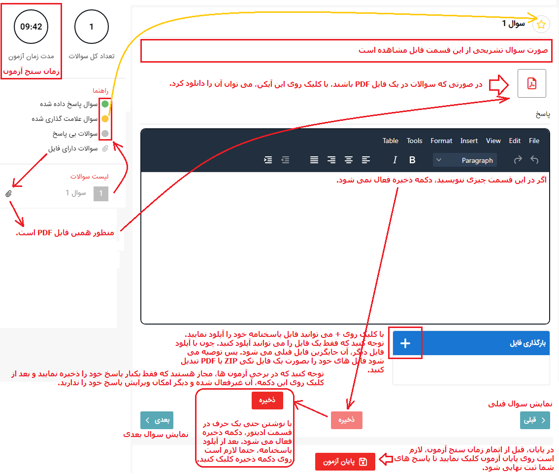 در آزمون تشریحی با ورود به آزمون، صفحه ای مشابه صفحه زیر را می بینید.