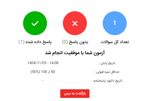 پس از اتمام آزمون و کلیک روی دکمه "پایان آزمون" پیامی مشابه زیر به شما نشان داده می شود که بیانگر اتمام موفقیت آمیز آزمون است.